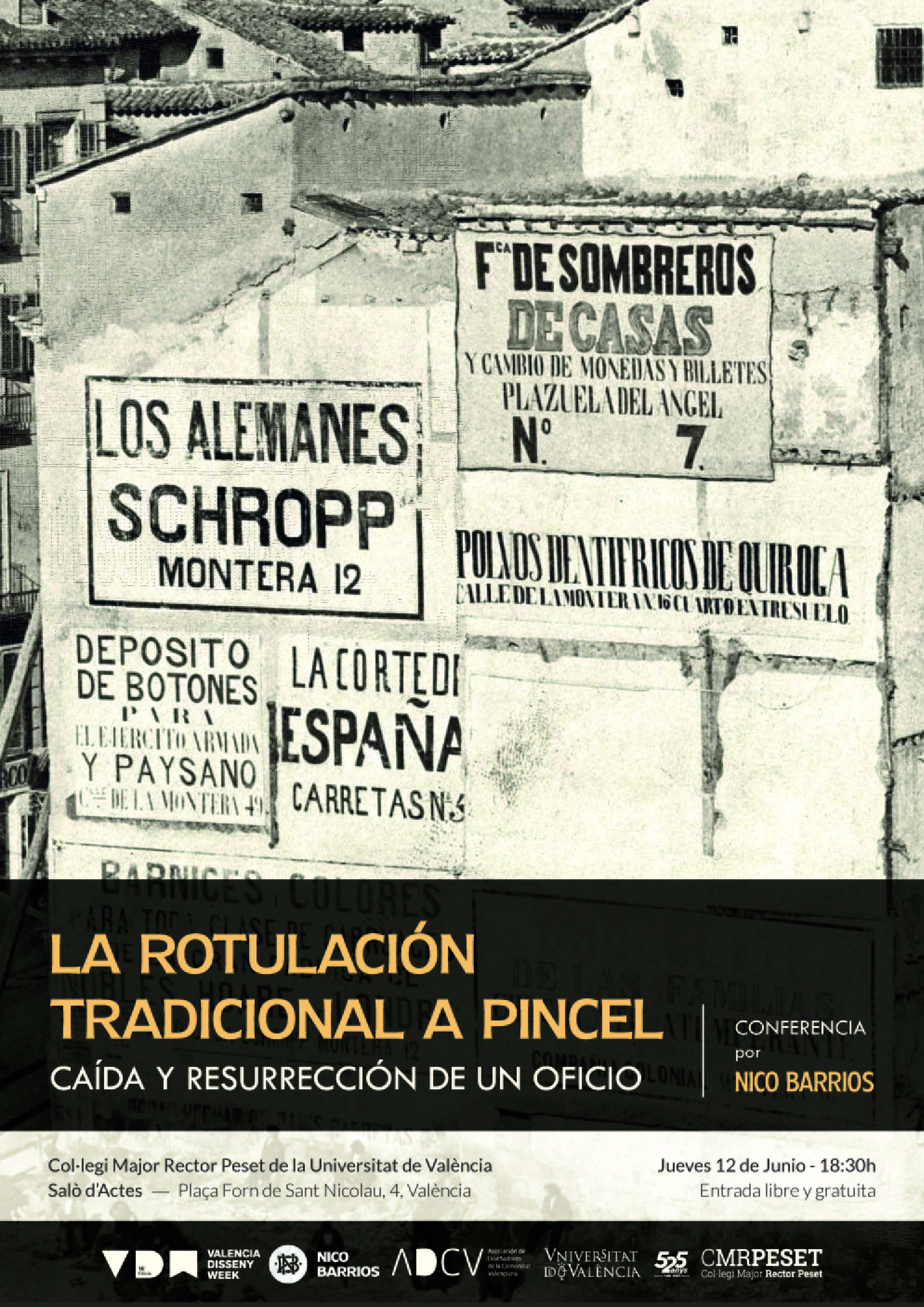 Conferecia sobre el oficio del pintor rotulista del s.XX en España y Valencia, impartida en el Col·legi Major Rector Peset de la Universitat de València, en el marco de la Valencia Disseny Week, organizada por la Asociación de Diseñadores de la Comunidad Valenciana (ADCV).